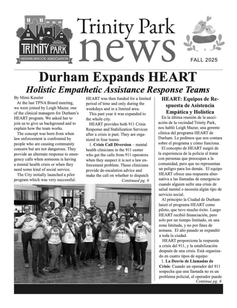 BECOME A TPNA MEMBER: Everyone in the neighborhood (about 1500 households) gets a copy of each newsletter, whether they are members or not. But we count on membership dues to help pay for printing costs. Join or renew your membership to help keep the Trinity Park News coming!