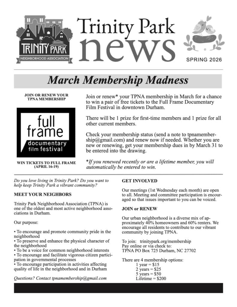 BECOME A TPNA MEMBER: Everyone in the neighborhood (about 1500 households) gets a copy of each newsletter, whether they are members or not. But we count on membership dues to help pay for printing costs. Join or renew your membership to help keep the Trinity Park News coming!